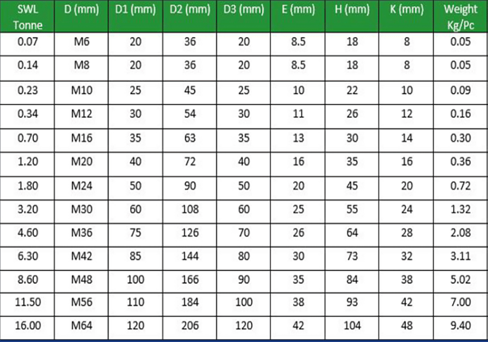 Lifting Eye Capacities (WLL - Working Load Limit) are available from 95kg all the way up to 30 tonne depending on model types.