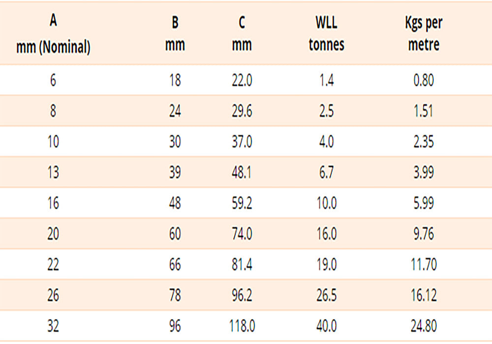 General: Chain for lifting. Has a maximum service temperature of 200°C.
