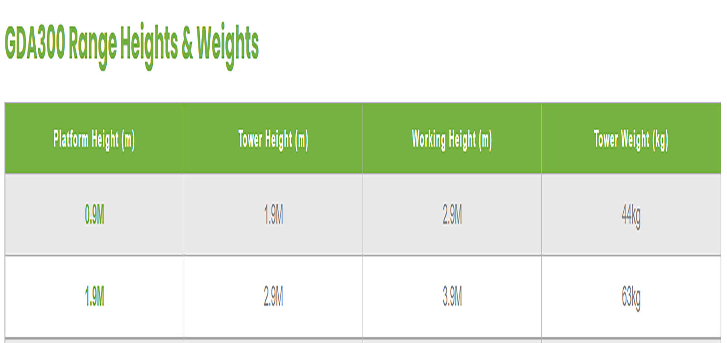 The GDA300 mobile scaffolding tower is the best solution for tradespeople who need fast, safe and easy access. The GDA300 is manufactured using 2" aluminium tubing which makes it robust, strong & long lasting. The GDA300 scaffold tower can be built and moved to any area of a site fast and easily. In fact it was designed to roll through doorways with a width of just 677mm.