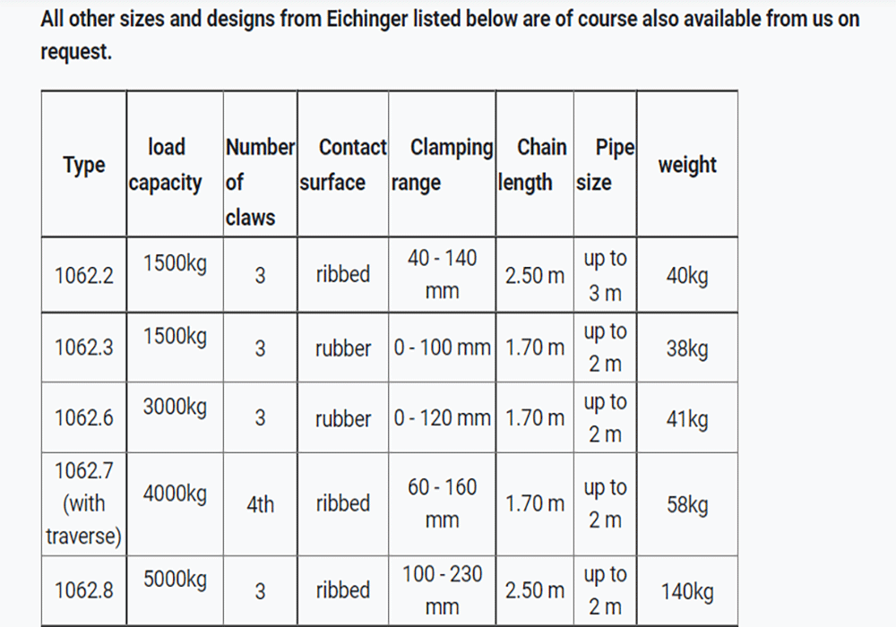 HIRE OR SALE "VERTICAL PIPE LIFTER CONCRETE MODEL 1062.2 EICHINGER SWL 1500KGS" SELFCOLOUR Type: 1062.2 , Load capacity: 1500kg , Claws: 3, Contact surface: ribbed Clamping range: 40 - 140 mm, Gripping depth: 310 mm, Chain length: 2.5m, Pipe size: up to 3m, Weight: approx. 40 kg Torsion-resistant, lightweight sheet steel construction for transporting and relocating vertical pipes and cones. The use is intended for all common manhole rings: thin-walled manhole rings, Manhole rings according to DIN 4034, part 1 Manhole rings according to DIN 4034, part 2, Manhole necks cones coated manhole rings, High-strength, galvanized chain